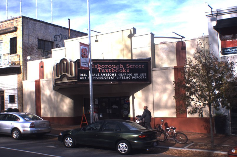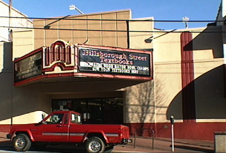 On October 19, 2015, in the boring regular universe, Rufty-Peedin Design Builders uploaded a picture to Facebook of two of their trucks underneath the marquee of a (former) local movie theater; best known today as the (former) Hillsborough Street Textbooks.