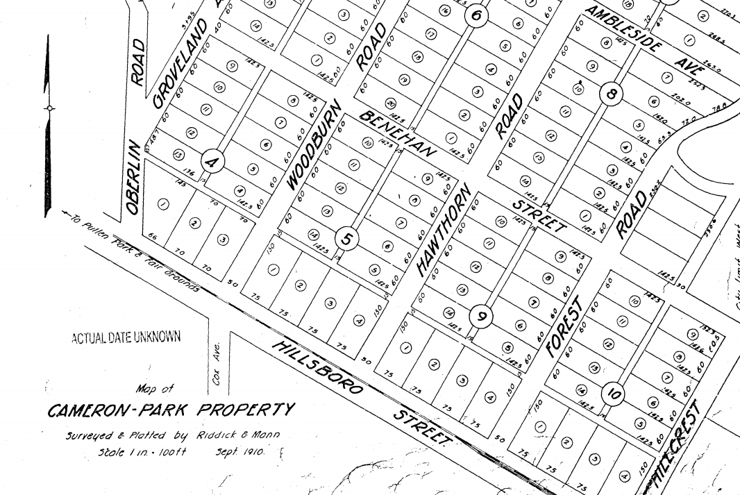 Cameron Park is considered one of the original ITB “streetcar suburbs” of Raleigh and was developed by the now defunct Parker-Hunter Realty company. Note: their old masonry office building still stands today, at 128 South Salisbury. The logo is engraved in the top of the building and visible in this photo: