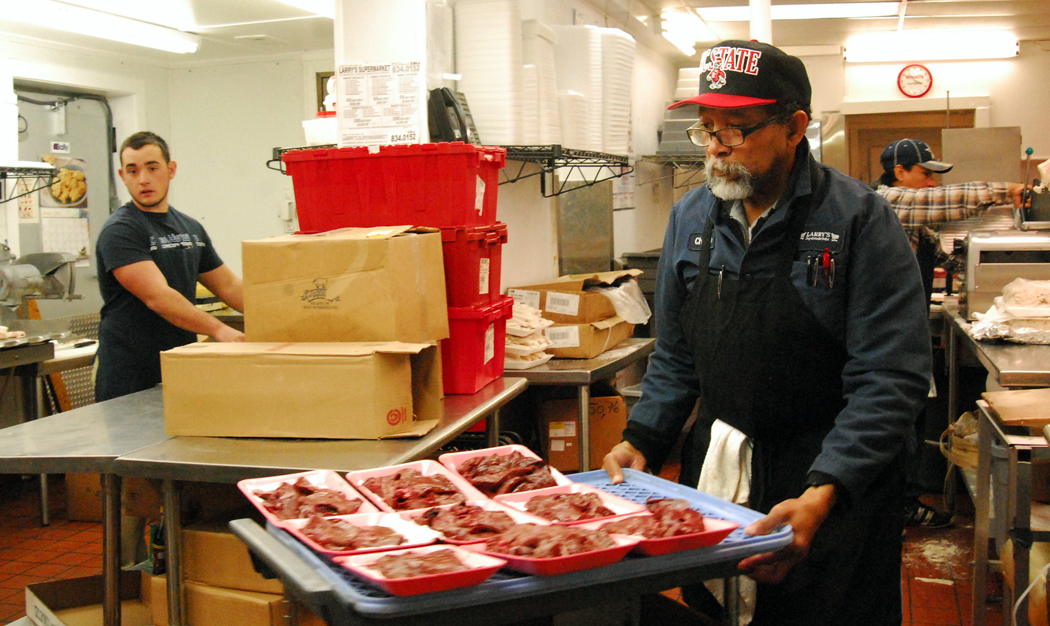 On any given afternoon the meat department of Larry’s is alive with slicing and packaging as employees restock the meat shelves. Charlie Perry is involved in all aspects of keeping the meat department operating plus answering customers’ questions.