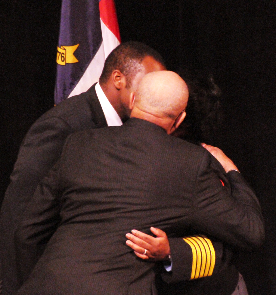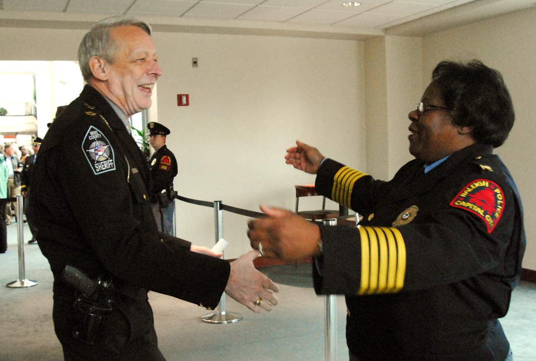 Wake County Sheriff Donnie Harrison congratulates Deck-Brown following the swearing-in ceremony.