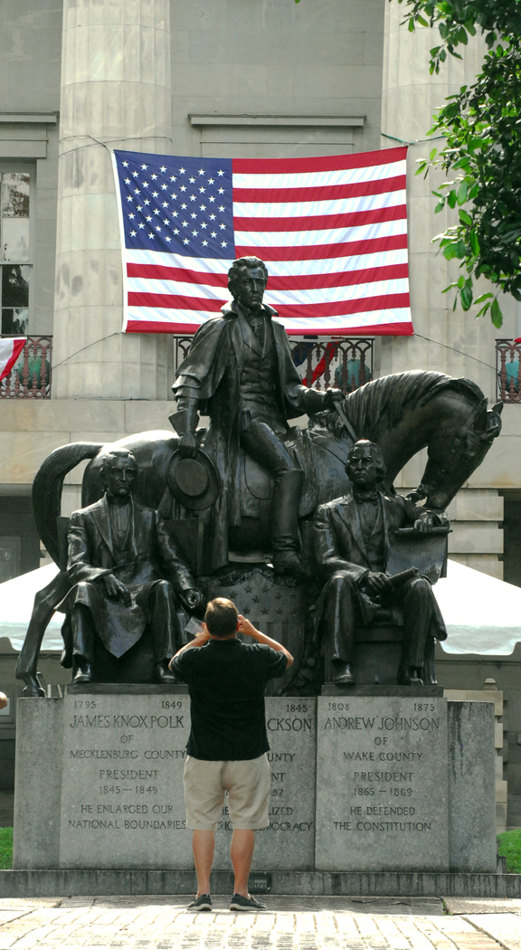 A visitor takes a photo of the statue of the U.S. Presidents from North Carolina at Capitol Building. From the left James Polk, Andrew Jackson, and Andrew Johnson.