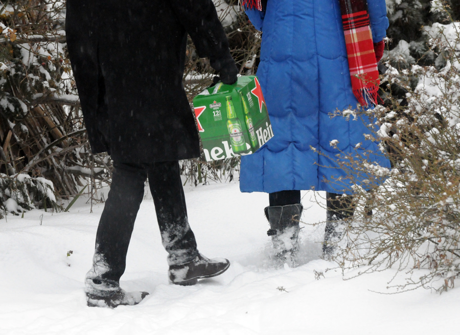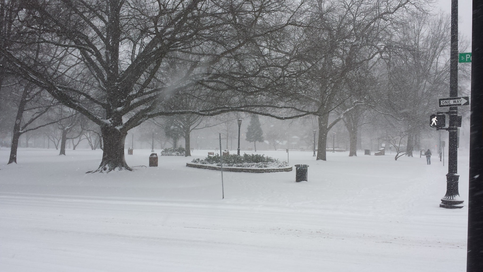 Raleigh's acorn watches over a snowy Moore Square. The Red Hat building and Skyhouse construction are just barely visible in the background.