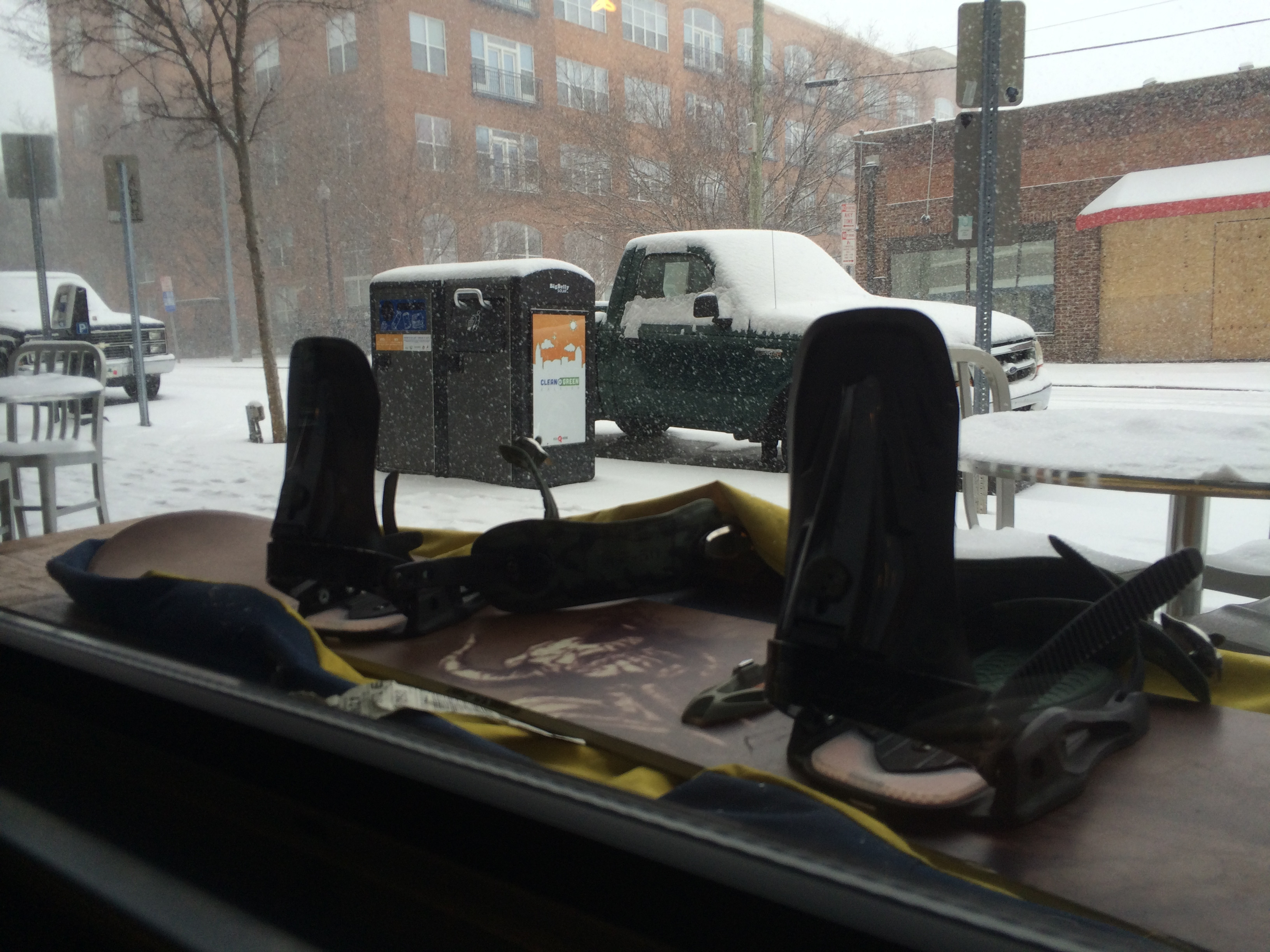 A snowboard stands ready in the window of Cafe de Los Muertos in downtown Raleigh.