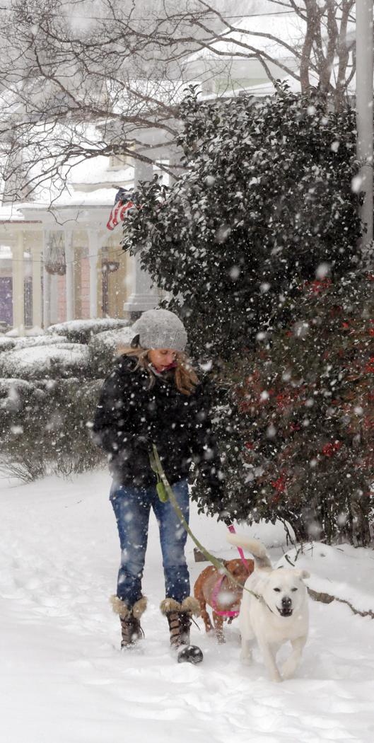 Katie Rittershaus with dogs, Tucker and Elsa make their way up East Street.
