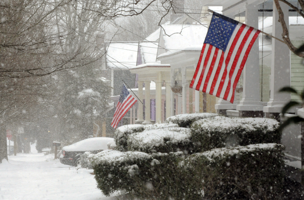 Residents on East Street in Oakwood show their patriotism during Wednesday's snowfall.
