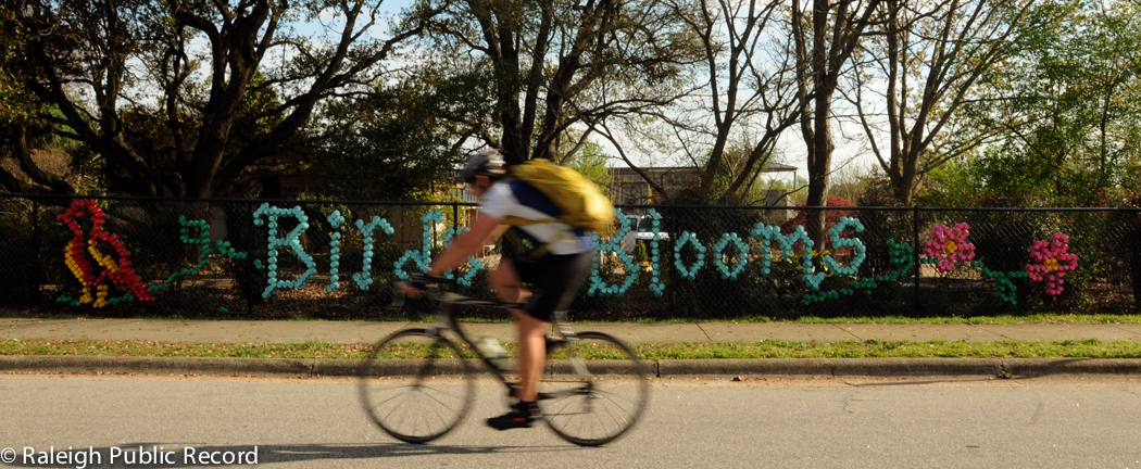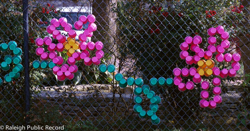 The JC Raulston Arboretum in Raleigh used colorful plastic cups placed the their fence along Beryl Road to promote their Birds and Blooms programs. The JC Raulston Arboretum is a nationally recognized garden, with the most diverse collection of cold hardy temperate zone plants in the southeastern United States. The arboretum is open to the public 365 days a year.