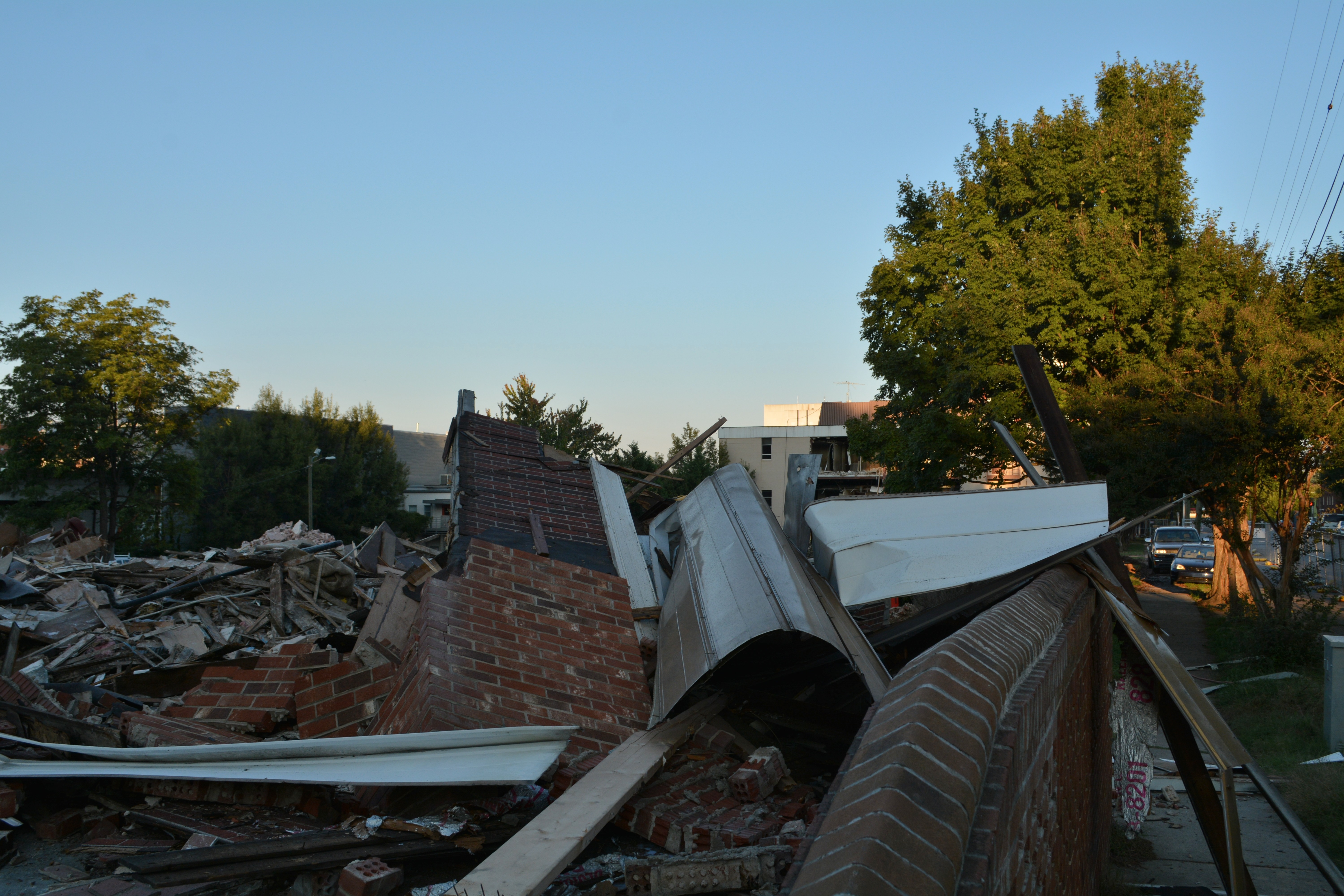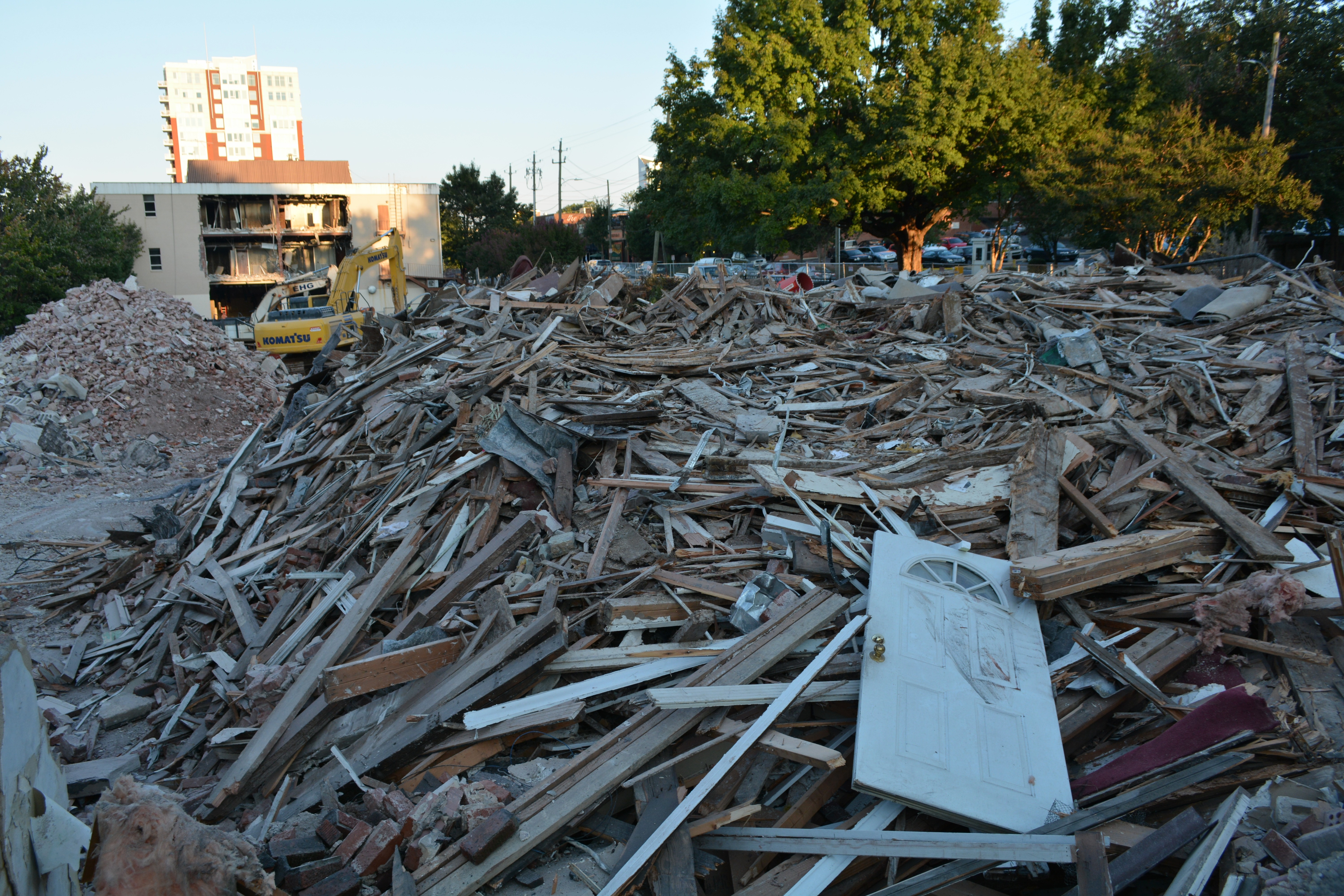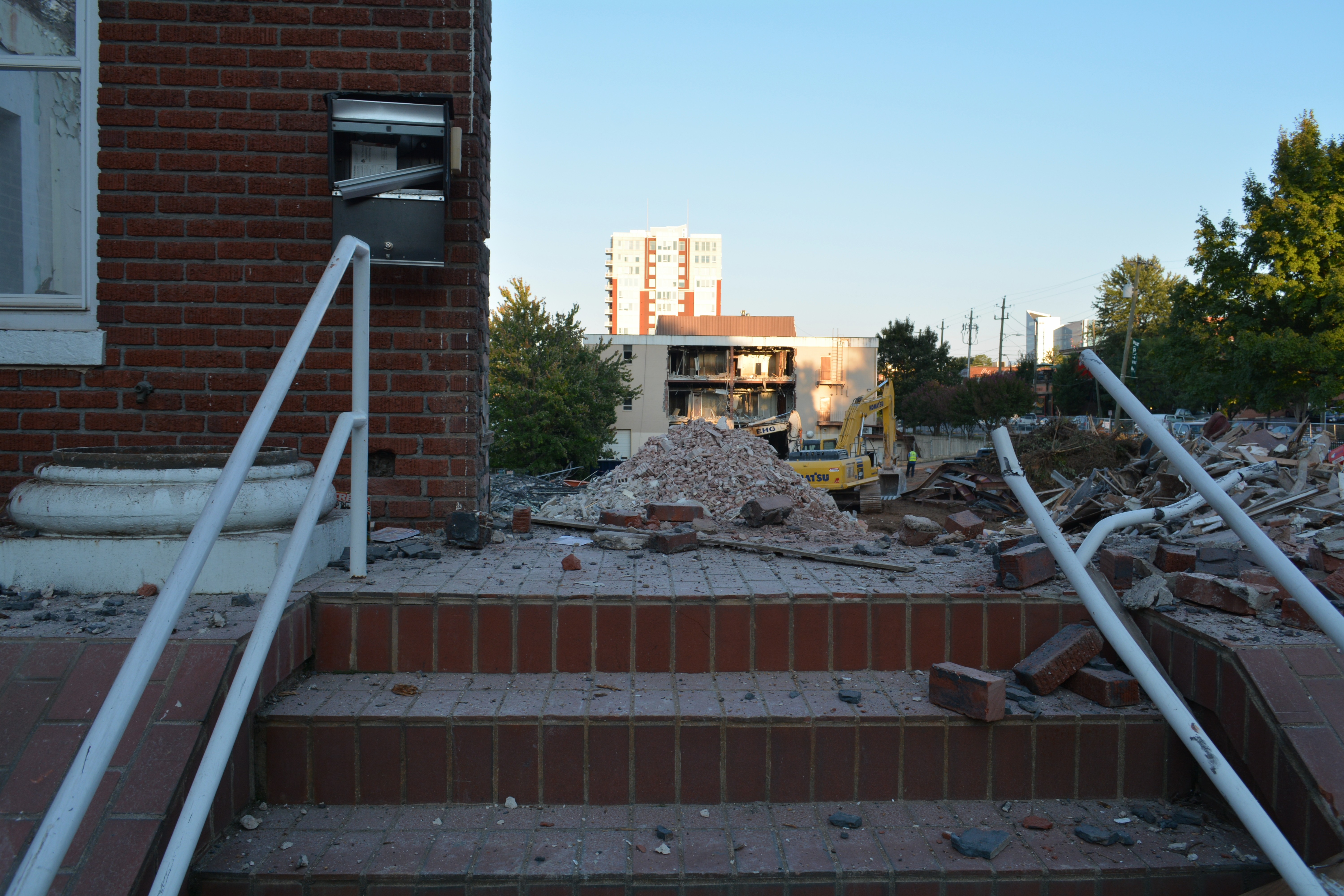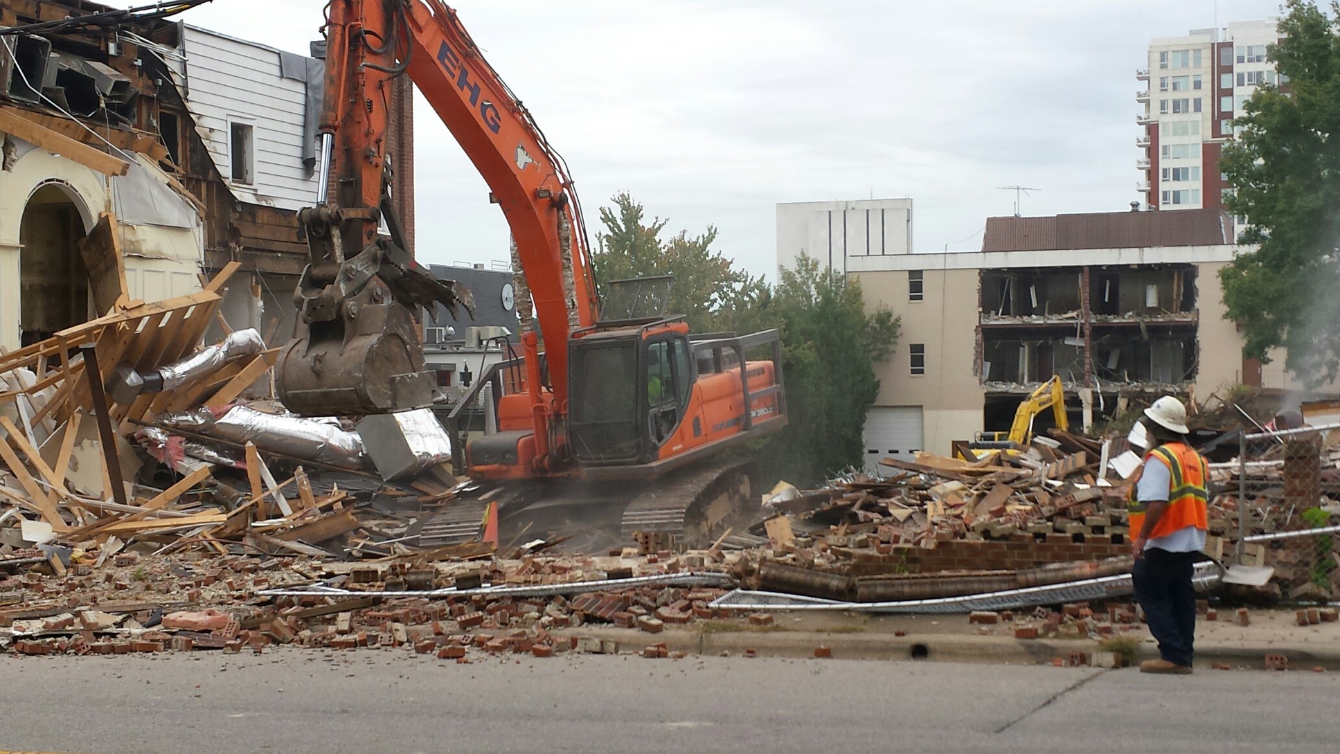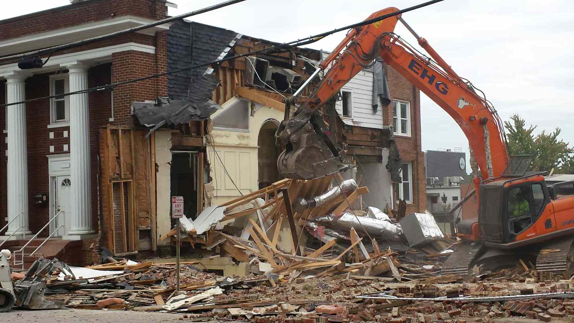Demolition to make way for the new Gramercy Apartments on North Street began in earnest yesterday, as the Greater Life Christian Church on Boylan Avenue was reduced to rubble and the teardown began on an office building on an adjoining lot facing Glenwood Avenue.