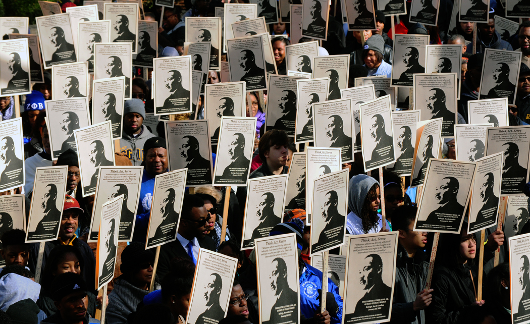Antwan Wright-Arrington, 3, of Raleigh, carries the Martin Luther King, Jr. sign during the march as his mother, Mechell Wilson, carries his scoter.