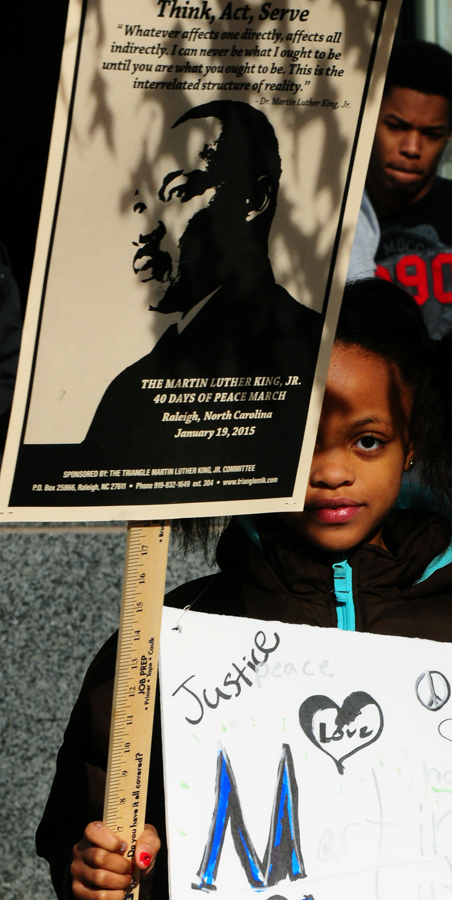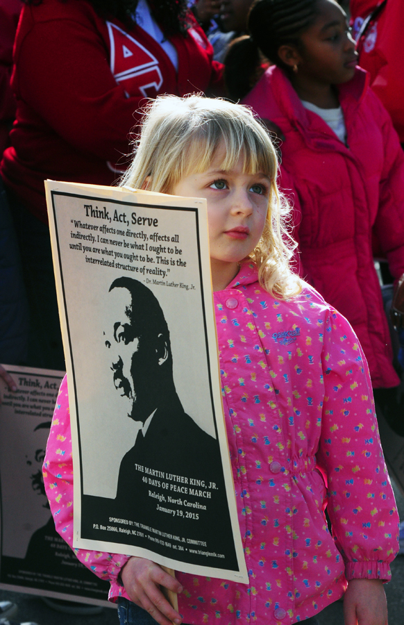 Five year old Lucy Scott of Raleigh waits to begin the MLK, Jr. Day March in Raleigh.