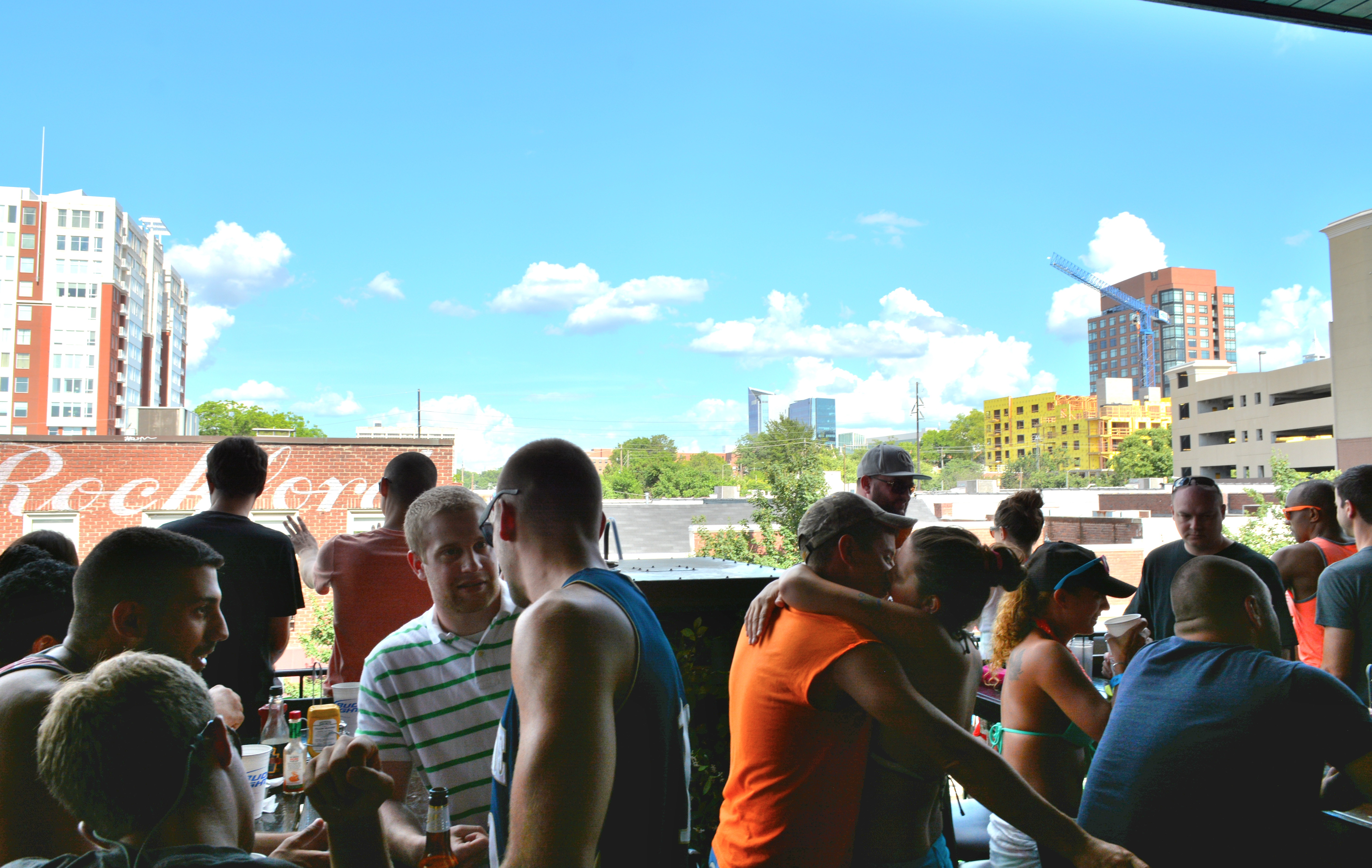 An enthused crowd watches the Slide the City event from the rooftop of the Hibernian